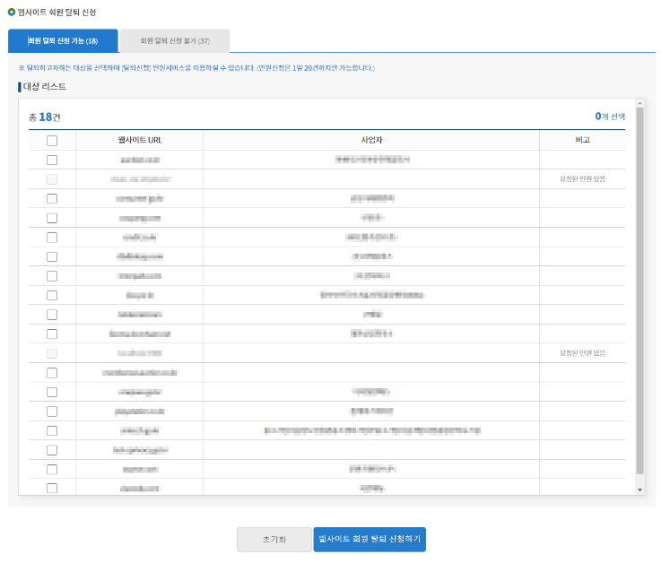 사이트 목록이 나오면 표시된 웹사이트 중 불필요하다고 생각하거나 도용이 의심되는 웹사이트에 대해 회원탈퇴 요청을 할 수 있다.