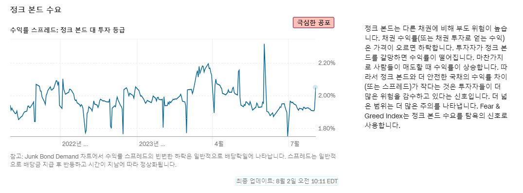 따라서 정크 본드 수요와 더 안전한 국채 수익률의 차이가 작다는 것은 투자자들이 더 많은 위험을 감수하고 있다는 신호입니다.