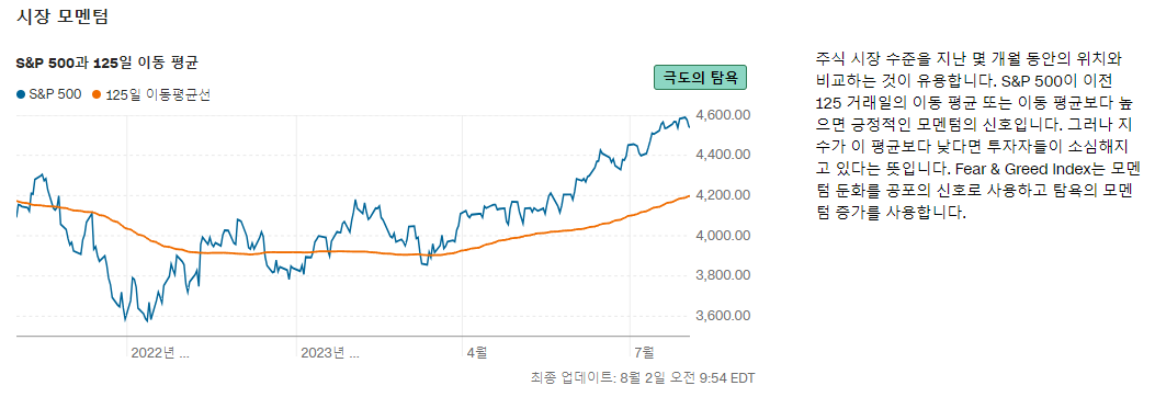 S&P500 이전 125 거래일의 이동 평균보다 높으면 긍정적인 모멘텀의 신호입니다. 반대로 이보다 낮으면 투자자들이 소심해지고 있다는 뜻입니다.