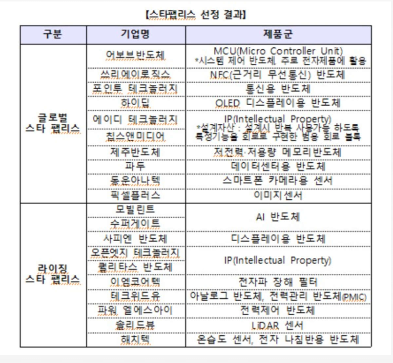 정부는 국내 20개의 기업을 '스타 팹리스'로 지정하였습니다. 이 기업들은 시제품 제작, 금융, 마케팅 등의 종합적인 지원을 받게 됩니다. 이러한 지원은 반도체 설계 분야에서의 경쟁력을 높이기 위한 것입니다.