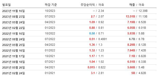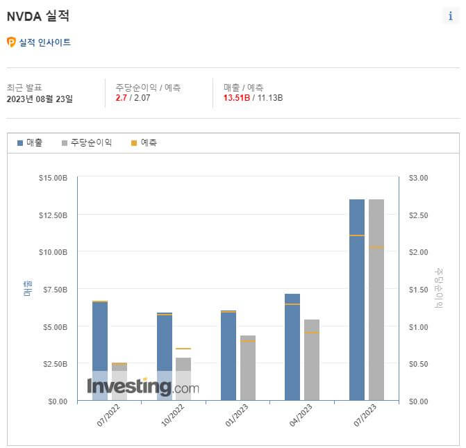 최근 발표된 주당 순이익은 2.7로, 예측치인 2.07보다 높게 나타났습니다. 이는 엔비디아의 성장세가 예상보다 더 강력하다는 것을 의미합니다.