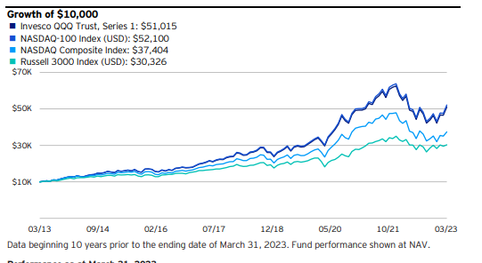QQQ는 기술 부문의 강력한 성과를 반영하여 지난 10년 동안 상당한 성장을 보였습니다.