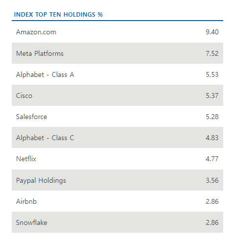 작성 당시 WEBL의 최고 보유 자산에는 Amazon, Facebook, Google(Alphabet Inc) 및 Netflix와 같은 거대 기술 기업이 포함됩니다.